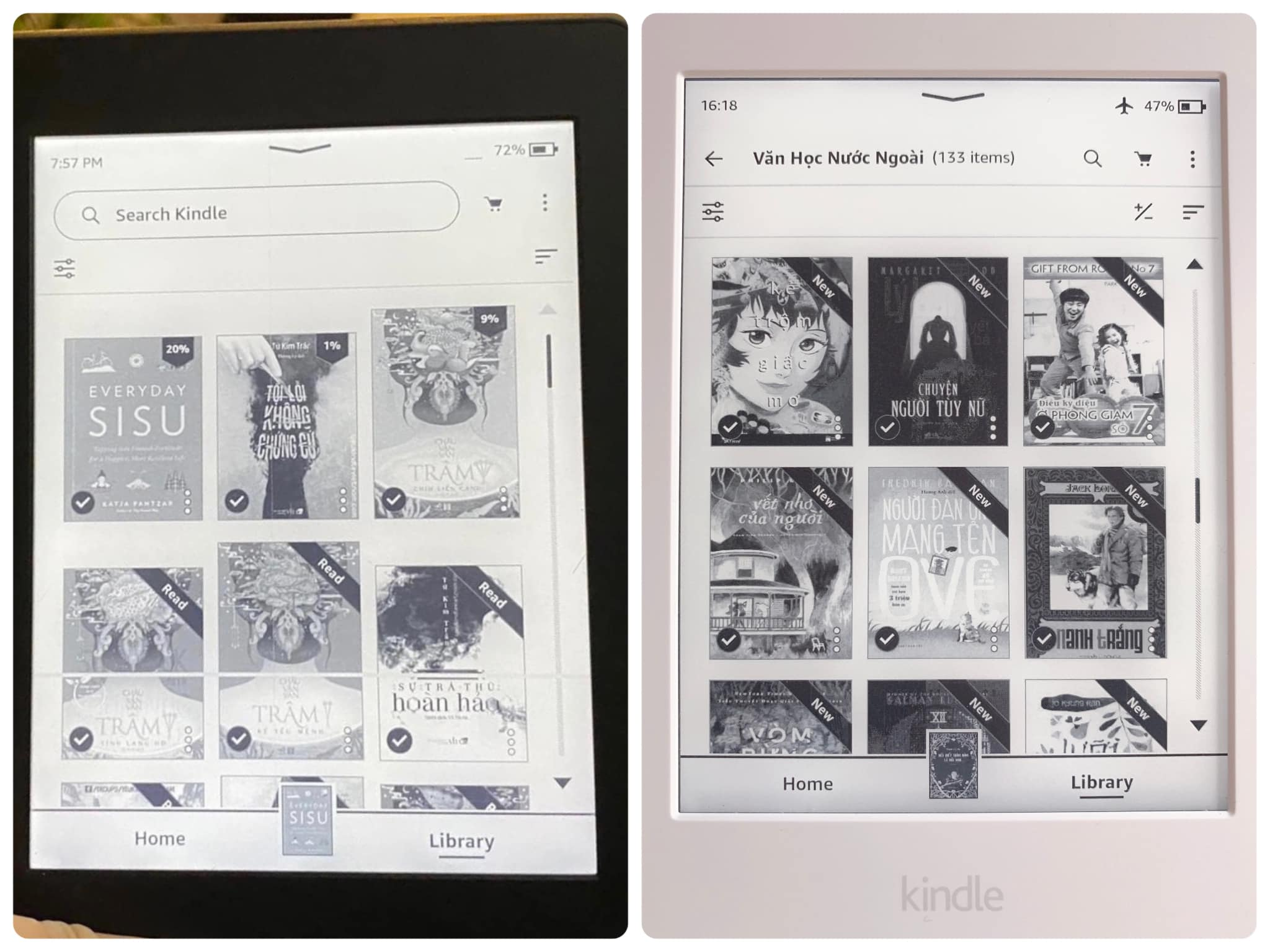 Các file sách tải về sẽ có kích cỡ bìa ngẫu nhiên, tùy người làm ebook. Nếu bạn dễ tính và thấy các cuốn sách cao thấp khác nhau cũng không sao cả (như chiếc Kindle bên trái ảnh 1), thì có thể bỏ qua bài viết này.